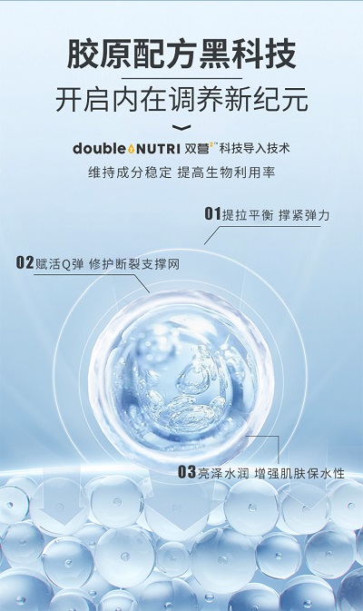 1、胶原配方黑科技,开启内在调养新纪元,double NUTRI 双营科技导入技术。