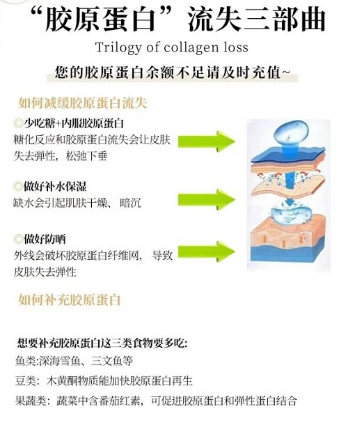 1、少吃糖+内服胶原蛋白:糖化反应和胶原蛋白流失会让皮肤失去弹性,松弛下垂;