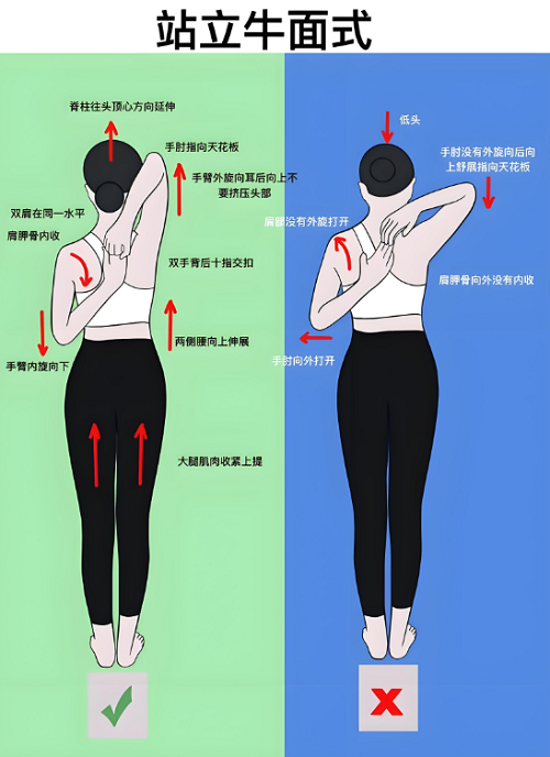 • 站立牛面式:站立,将右手臂向上伸直,然后弯曲手肘,让右手掌向下放置在背部中间位置;左手臂向下伸直,弯曲手肘,左手掌向上,尝试与右手掌在背部相扣。保持这个姿势 15-20 秒,然后换另一侧重复。