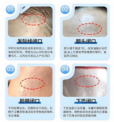 首先我们来了解一下,这些小疙瘩是什么。这些小疙瘩就是我们常说的闭口,油脂堆积或肌底炎症在表面形成凸起,大小不大于2mm,用手摸就可以感受到它。一般闭口以成因可以分为以下四种:油脂型、代谢型、痤疮型、屏障受损型。